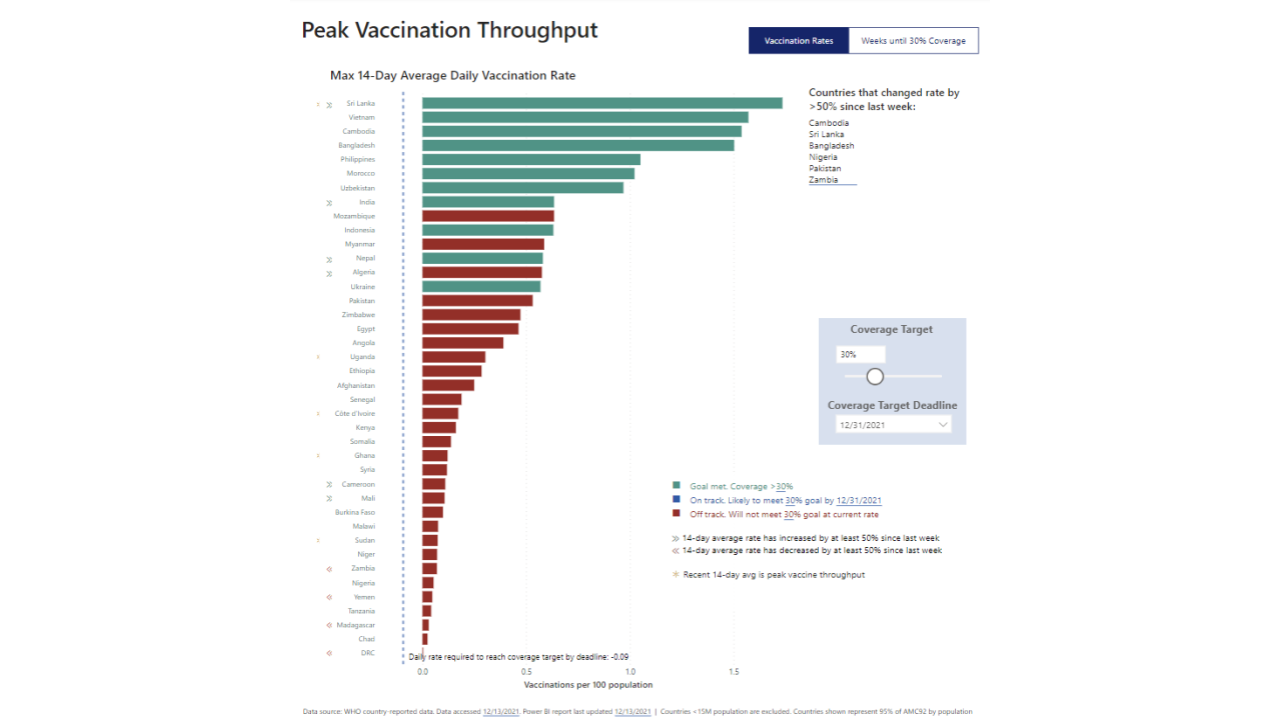 To meet the equitable distribution goal, the organization was targeting 30% vaccine coverage in all countries by the end of 2021. Goal-tracking visualizations showed countries reaching, on track or at-risk for meeting that goal based on vaccination rates, allowing policy teams to adjust tactics to reach goals on a country-by-country basis.